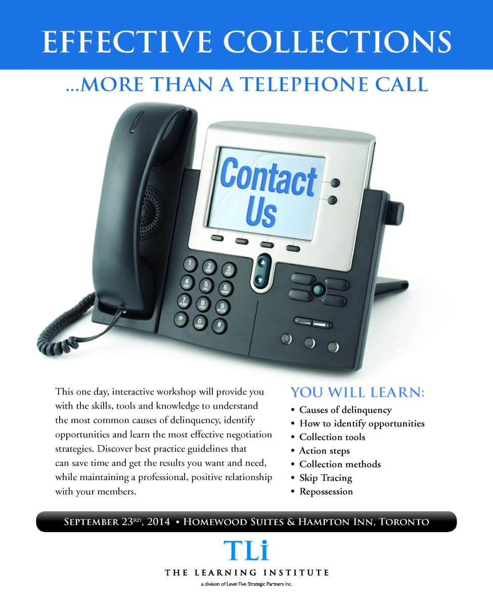 Level Five recognizes that from time to time credit unions are faced with past due loans, lines of credit or mortgage accounts. In order to get the best results for the credit union and the member, employees must have the knowledge, skills and tools to effectively deal with these challenging often frustrating situations. Our collection series of workshops are designed to give staff the confidence needed to successfully collect delinquent accounts in a professional manner while maintaining a good relationship with the member. Each workshop includes course material that serves as an excellent guidebook back at the credit union.